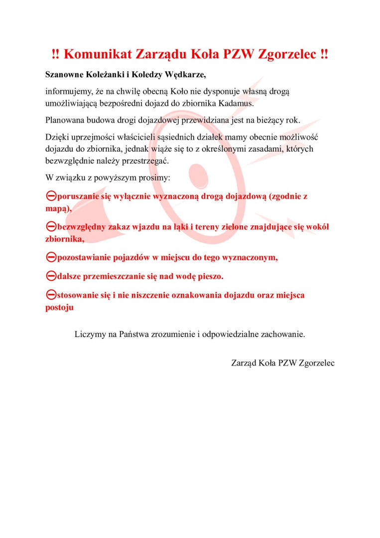 Apelujemy do wszystkich wędkarzy o poszanowanie prywatnej własności oraz pracy właścicieli gruntów, dzięki którym mamy możliwość korzystania z tego dojazdu. Nieprzestrzeganie powyższych zasad może skutkować utratą dojazdu do zbiornika oraz niepotrzebnym konfliktem.